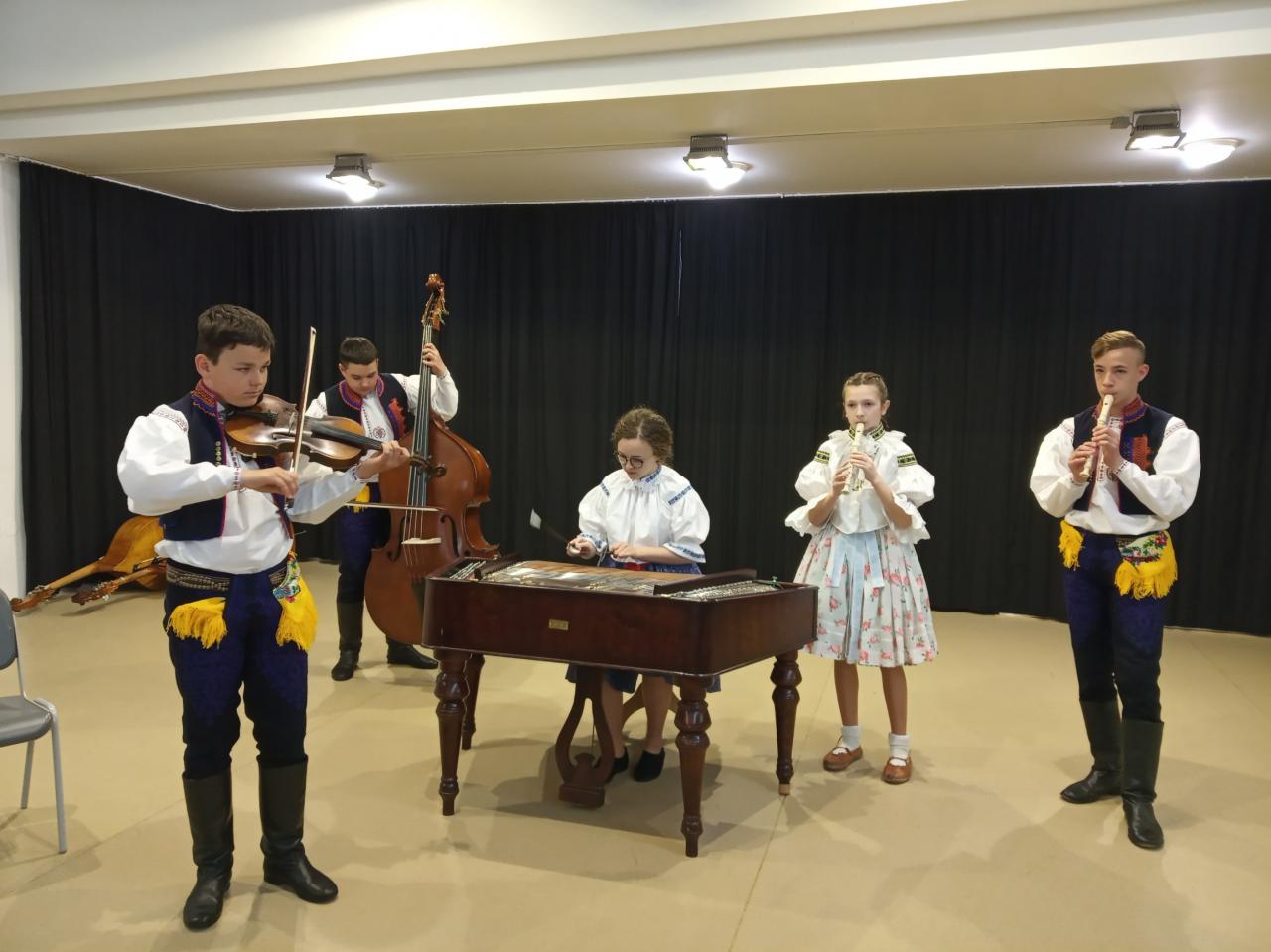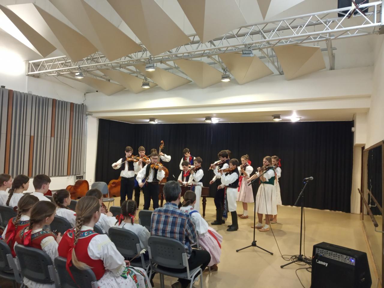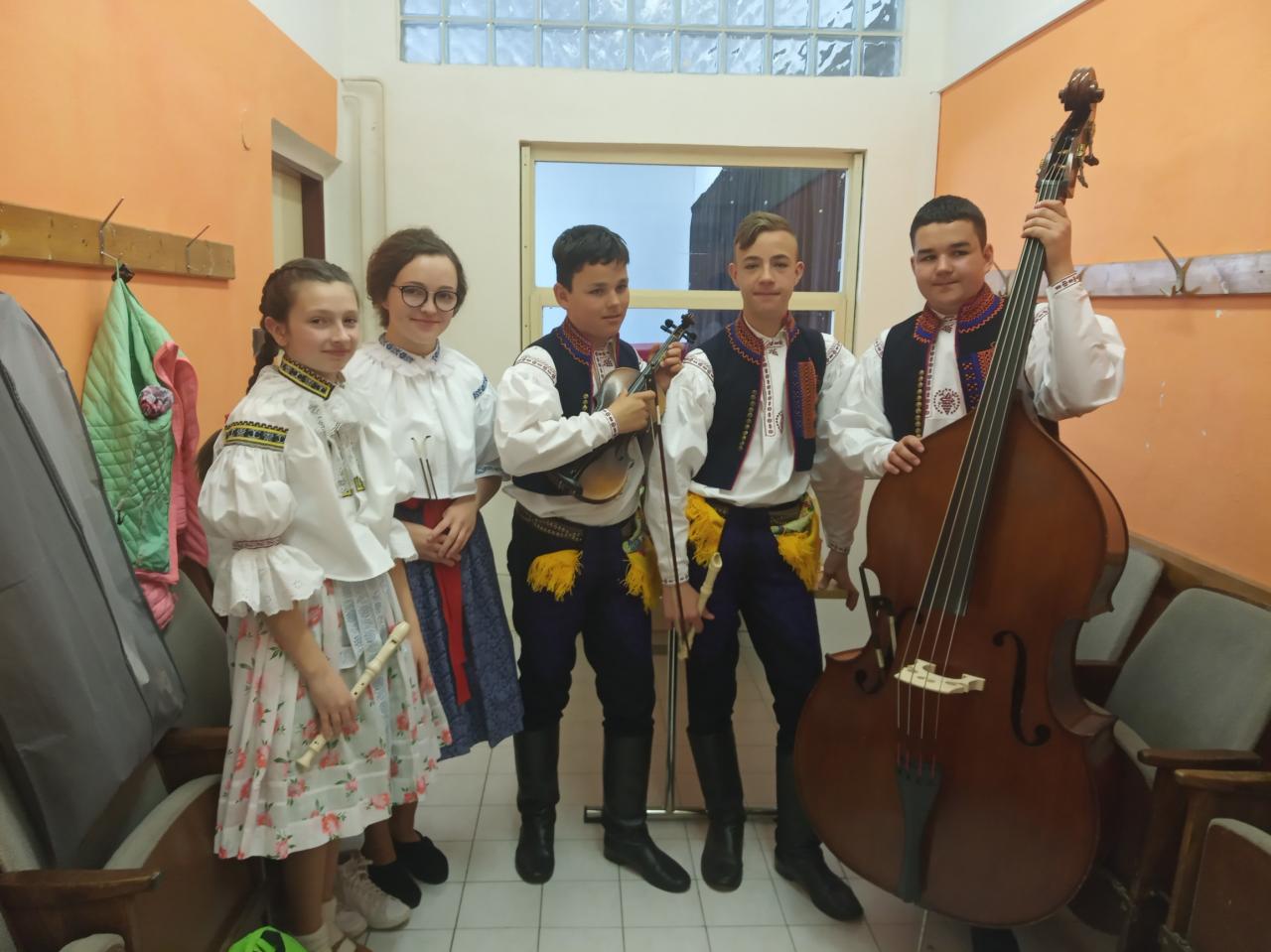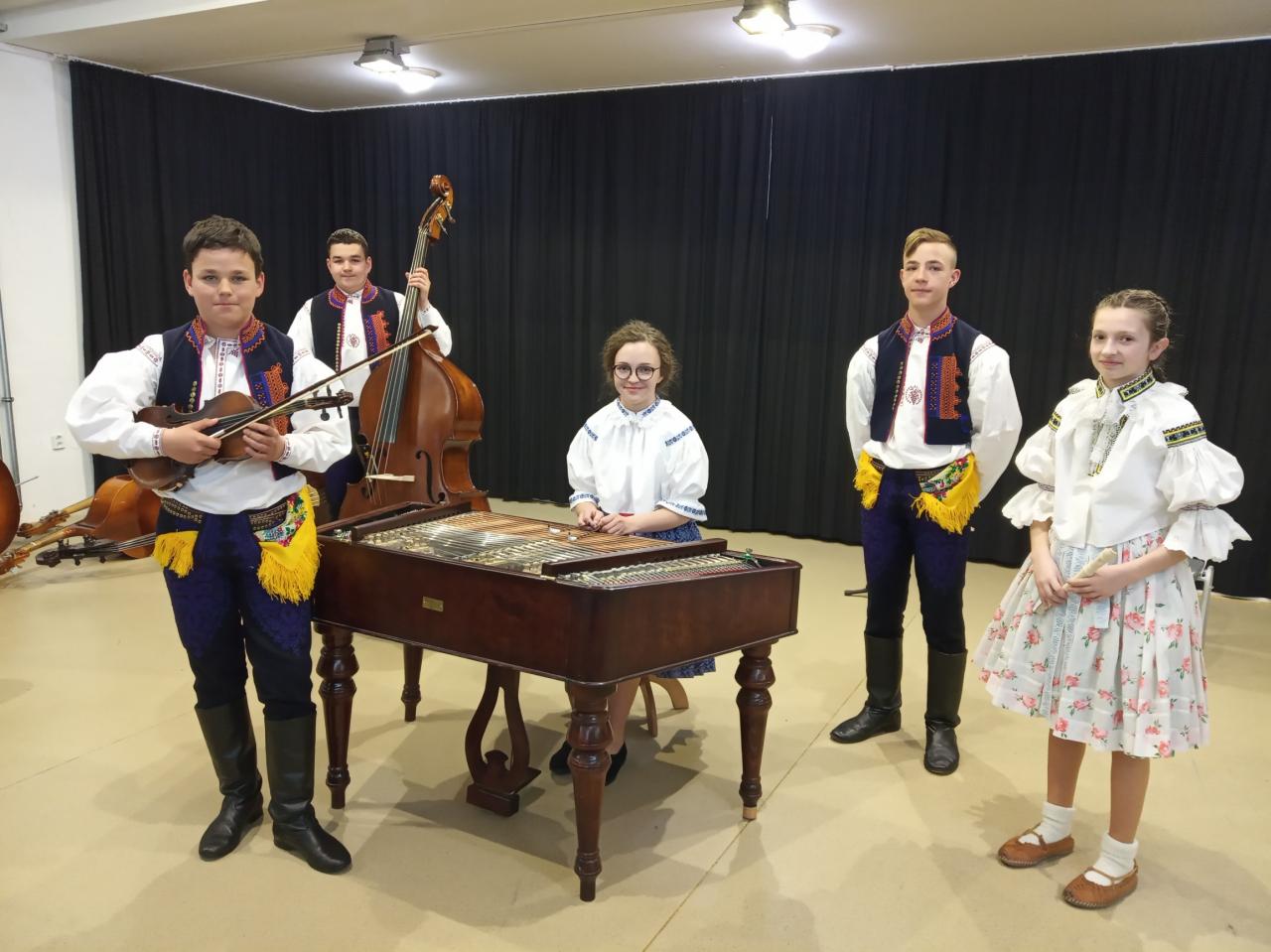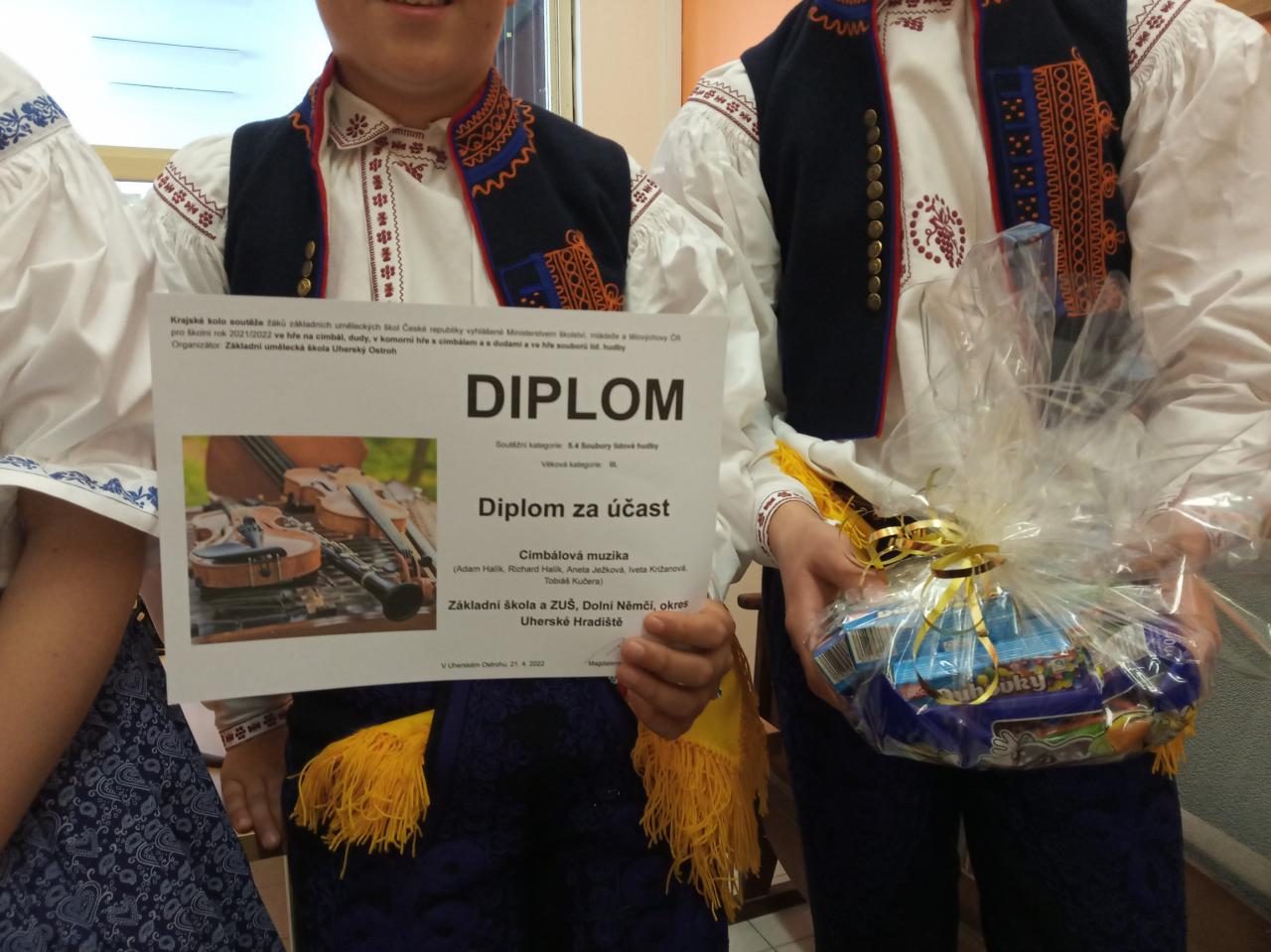 Ve čtvrtek 21. dubna 2022 jsme se s naší mladou cimbálovou muzikou zúčastnili krajského kola soutěže lidových souborů v Uherském Ostrohu. Soutěžilo zde celkem 9 souborů ze zlínského kraje. Slyšeli jsme hrát tyto cimbálové muziky: Valášek, Malina, Strunka a Strunečka – Zlín; Husličky – Uherské Hradiště; Dolinka – Staré Město u Uh. H.; Marijánek – Rožnov pod Radhoštěm. Konkurence byla opravdu veliká a výkony profesionální. Přivezli jsme si diplom za účast a jsme moc rádi, že jsme prožili krásné dopoledne s tak skvělými soubory, které nás inspirovaly k další práci. Naše cimbálovka existuje teprve pár let a jsme rádi, že jsme si mohli zahrát a že se o nás už trošku ví. Přemýšlíme o tom, jak se budeme jmenovat…Kéž by se naše řady rozrostly o nové hráče...Děkujeme všem: Anetce Ježkové, Ivetce Križanové, Ríšovi Halíkovi, Adamovi Halíkovi, Tobíkovi Kučerovi, paní učitelce Adélce Bruštíkové, ochotným rodičům a také porotě soutěže za sladkou odměnu.